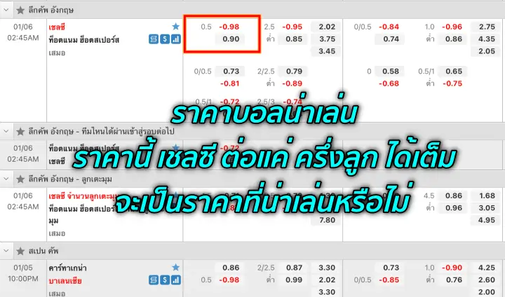 การดูราคาว่าราคาไหนน่าเล่นนั้น ให้เลือกดูไปถึงค่าน้ำด้วย อย่างในรูปที่ทีม เชลซี ต่อ ครึ่งลูก แล้วได้ค่าน้ำเต็มๆ หลายท่านเองก็คงจะโดเล่น เชลซี กันเป็นแน่แท้ แต่ถ้ามองให้ดีๆ ถ้า เชลซี จะชนะจริงๆ ทำไมโต๊ะให้ค่าน้ำเต็ม ทำไมไม่ให้ค่าน้ำน้อยลงมาล่ะครับ