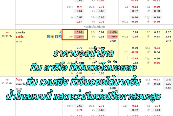 เมื่อดูเป็นแล้วว่าราคาน้ำมันไหลขึ้นหรือไหลลงนั้น ก็สามารถที่จะเลือกทีมแทงได้ง่ายๆครับ โดยดูในรูปด้านล่าง ท่านเองจะเห็นว่าราคาบอลต่อของทีม ลาซิโอ ในราคา 0.5 ค่าน้ำมันไหลลงคือได้น้อยลง ซึ่งต่อแพงแบบนี้ ค่าน้ำยังไหลลงอีก และเมื่อดูอีกส่วนจะเห็นว่าค่าน้ำทีมรองนั้นไหลขึ้นด้วย
