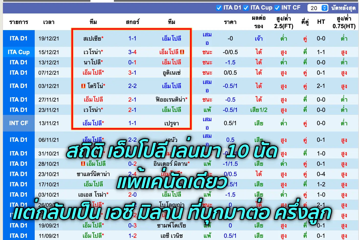 ก็ดูครับว่าในสถิติการเล่นทีม เอ็มโปลี ทีมรองนั้นเป็นยังไง จะเห็นครับว่า เอ็มโปลี นั้นเล่นมา 10 นัด หลังแพ้มาแค่นัดเดียวเท่านั้น แบบนี้ถือว่าฟอร์มดีสุด
