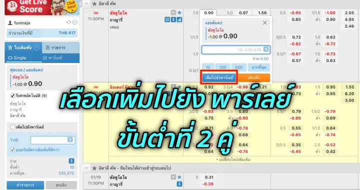 ขั้นตอนการแทงมันไม่ได้ยากเลยครับ เพียงแค่ท่านนั้นเลือกราคาในการเล่นของบอลคู่ที่ท่านอยากจะแทง จากนั้นก็เลือก พาร์เลย์ เอาได้เลย มันจะขึ้นเป็นการแทงบอลสเต็ปให้ท่านไดเทันที จากนั้นก็เลือกทีมที่เหลือ โดยขั้นต่ำในการแทงบอลสเต็ป มันอยู่ที่ 2 คู่ เท่านั้น